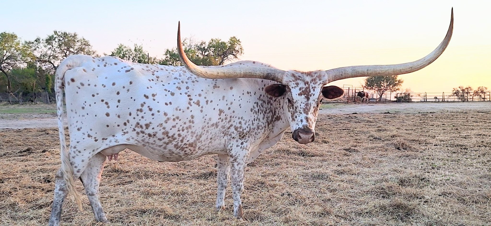 We acquired RO Christmas Snow from Rocking O Longhorns in 2020 because of her incredible horn and beautiful spots. Her pedigree goes back to names like Matt Dillon, Winchester, Senator and many more. Her massive horn pedigree top and bottom from BL Peggy Sue and Creole Dixie Lee.