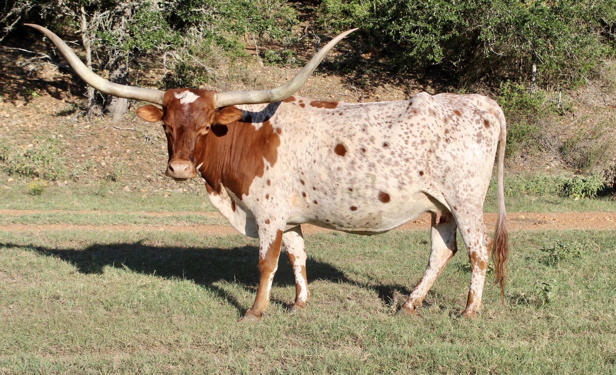 This speckled up cow will out produce herself. She may not be the longest horned cow in the pasture but she is a great momma and raises healthy strong calves. HEIFER baby born 10/21/2022 out of Pearl Snap BCB!
